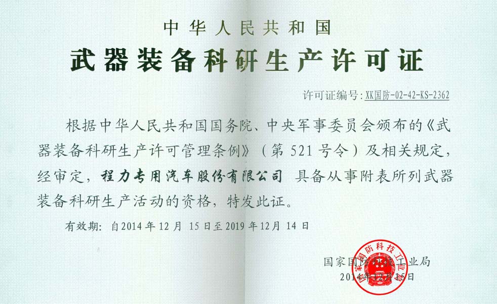 几乎通过了专用车类所有国内国际认证,具有客车生产资质、特种车生产许可资质和国家武器装备科研生产资质,840多个“程力威”牌产品列入国家公告目录。