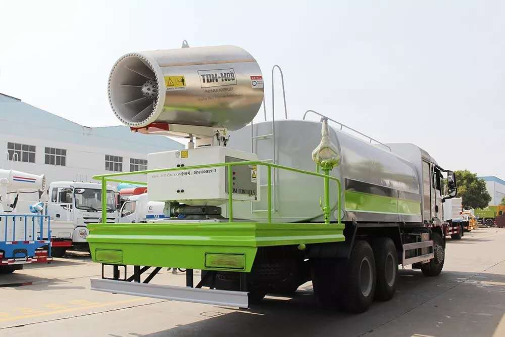 该抑尘车罐体采用武钢优质Q235钢材制作,(国标4mm厚),罐体16立方,罐体内做环氧玻璃鳞片防腐,前冲喷头两个,后洒喷头两个,侧喷喷头两个,6个喷头气控阀驾驶室控制阀门开关,洒水高炮(射程26-28米)炮喷洒形状可调节(大雨、中雨、毛毛雨、雾状),采用50/110大功率专用水泵.带大平台。后箭头灯。