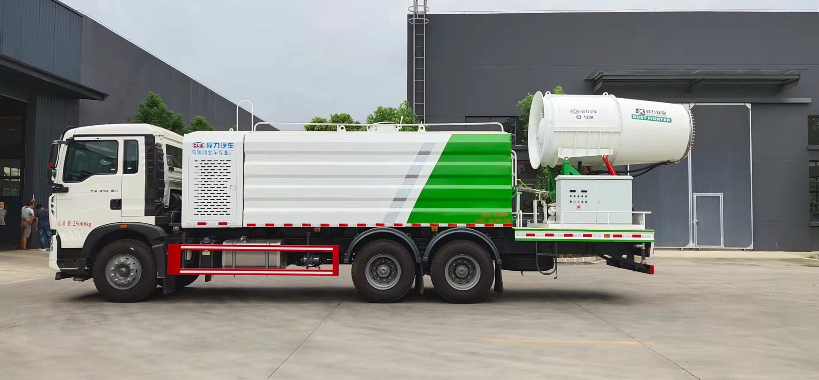 该抑尘车罐体采用武钢优质Q235钢材制作,(国标4mm厚),罐体16立方,罐体内做环氧玻璃鳞片防腐,前冲喷头两个,后洒喷头两个,侧喷喷头两个,6个喷头气控阀驾驶室控制阀门开关,洒水高炮(射程26-28米)炮喷洒形状可调节(大雨、中雨、毛毛雨、雾状),采用50/110大功率专用水泵.带大平台。后箭头灯。